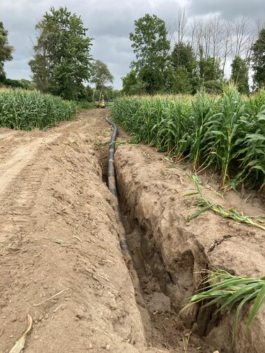 Work was completed on the installation of an irrigation pipe on a dairy farm. The irrigation pipe will help the farm combat the increasingly common drought conditions brought on by climate change risking the production of their alfalfa fields used as a feed source.